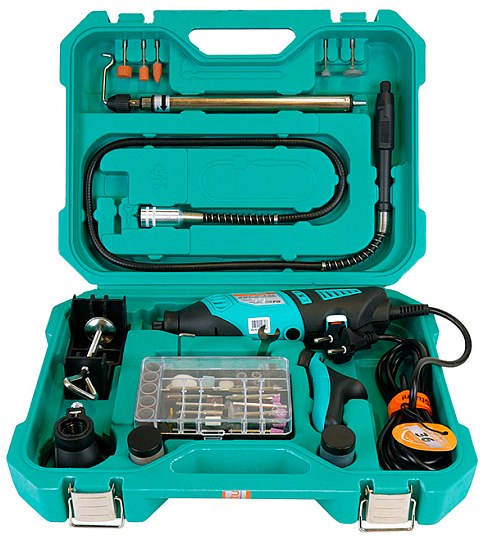 Хорошая эргономика корпуса с противоскользящими накладками дополняется наличием вспомогательной рукоятки для хвата при выполнении деликатных работ и стойки для подвешивания гравера с помощью складной скобы при работе с использованием гибкого вала.