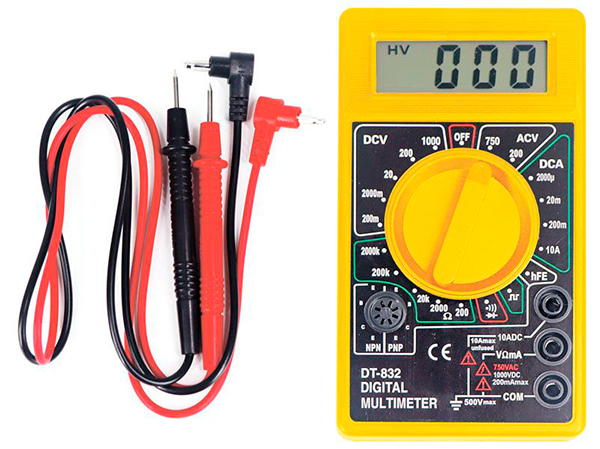 Для измерения постоянного и переменного напряжения, постоянного тока, сопротивления, коэффициента усиления транзисторов, проверки диодов и прозвонки соединений. LCD дисплей. В комплектации два тестовых щупа. Элемент питания: 9 В «Крона».