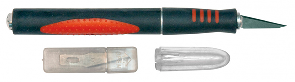 5 запасных лезвий в комплекте. Для резки бумаги, ткани, пластика, кожи, мягких пород древесины (напр. бальза) и других художественных работ. Материал: прорезиненный алюминиевый корпус, пластиковая крышка и вставки, лезвие из инструментальной стали. Упаковка: блистер.