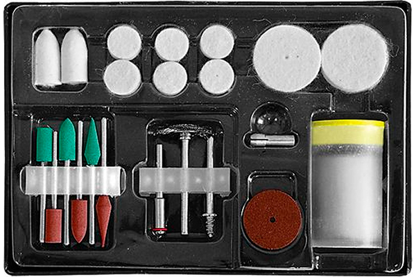 Для гравировальной машинки. В наборе: фетровые насадки; штифт для фетровой насадки; резиновый полировочный круг; штифт для полировочного круга; зажимной патрон; мини корщётка-насадка тип «колесо» (стальная волнистая пров