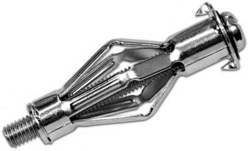 Дюбель 6х37 Molly для пустотелых конструкций и гипсокартонных стен. Подойдет для монтажа тяжелых предметов интерьера типа телевизора, полок и люстр. При установке, его центральная распорная часть складывается пополам в виде «зонтика», который прижимается к обратной стороне листового материала. На опорном бортике гильзы имеются зубцы, врезающиеся в основание и препятствующие ее проворачиванию при вращении винтового элемента.