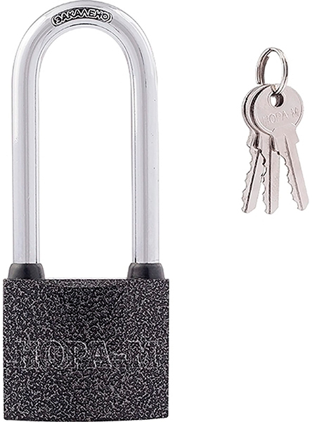 Навесной замок общехозяйственного назначения. Материал корпуса - сталь, цилиндра - латунь, дужка сделана из закаленной стали, в комплекте 3 стальных ключа. Для удобства в использовании дужка имеет удлиненную форму. Замок автоматически запирается без использования ключа. В процессе эксплуатации рекомендуем смазывать замок дужки и цилиндр графитовой или силиконовой смазкой.