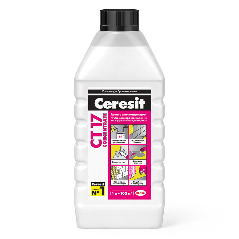 Грунтовка CT 17 Concentrate предназначена для обработки впитывающих, сильно впитывающих и непрочных оснований – бетона, цементных, известковых и гипсовых штукатурок, цементных, гипсовых и ангидритных стяжек, легкого и ячеистого бетона, кладок из керамического и силикатного