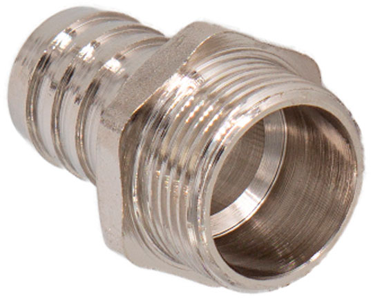 Штуцер под шланг с наружной резьбой 1/2"х 18 мм CTM - резьбовой фитинг, предназначенный для подключения поливочного шланга к водозапорной арматуре или непосредственно к трубопроводу. Изделие можно применять также в других системах с неагрессивной к используемым материалам рабочей средой (горячая вода, незамерзающий теплоноситель, сжатый воздух и т.д.). Штуцер изготавливается из горячепрессованной латуни. Дополнительный запас прочности обеспечивается за счёт покрытия никелем, предотвращающим появление коррозии, а также защищающим от механического износа и вредного воздействия агрессивных жидкостей и воздушно-газовых сред. Присоединительный патрубок штуцера имеет наружную резьбу с насечками для лучшего удержания герметика. Сам штуцер для шланга имеет конфигурацию, эффективную для его фиксации. Присоединение шланга необходимо производить с помощью стальных винтовых хомутов.